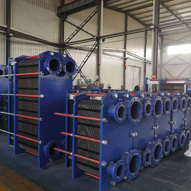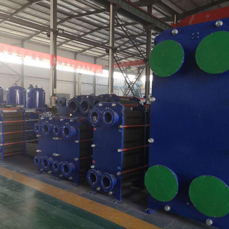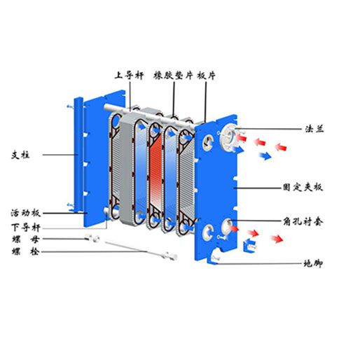 板式热交换器的组装形式为悬挂式和非悬挂式。安装时,热交换板悬挂在上导杆上。大型板式热交换器上导杆采用工字钢结构,下导杆采用矩形管结构。小型板式热交换器上下导杆采用元钢结构。活动夹紧板是一种相对固定的夹紧板。在安装和拆卸过程中,可以在上导杆上移动。较大型号上安装滚轮,以降低移动阻力。